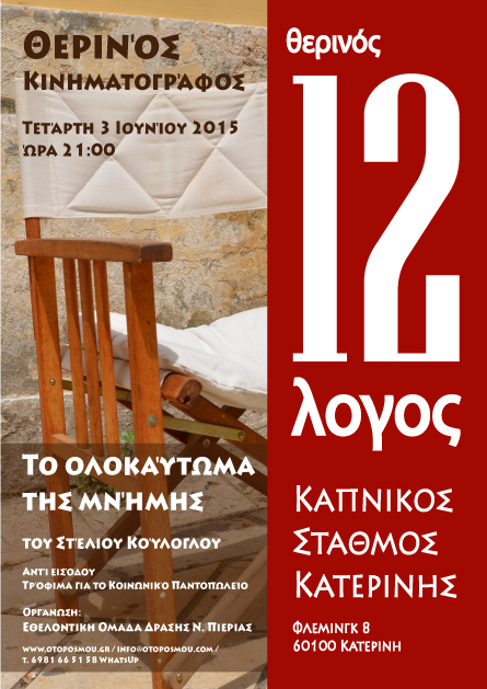 Έναρξη προβολών του Θερινού Κινηματογράφου 2015, την Τετάρτη 3 Ιουνίου κάτω από τον έναστρο ουρανό του Καπνικού Σταθμού. Θα προβληθεί η ταινία "Το ολοκαύτωμα της μνήμης" του Στέλιου Κούλογλου. Στο διάλειμμα, πιτσιρικάδες με καλαθάκια θα προσφέρουν πασατέμπος και πορτοκαλάδα. Όλοι θυμόμαστε εκείνες τις μαγικές νύχτες με φεγγάρι, μέσα στους Θερινούς Κινηματογράφους των παιδικών μας χρόνων. Με μοσχοβολιά από αγιόκλημα και γιασεμί. Τις ουρές στα θυρωρεία για ένα εισιτήριο, τη γλυκιά αναμονή για την ταινία που ο σινεμάς θα έπαιζε στην πόλη μας κι όλους εκείνους που παρακολουθούσαν τις ασπρόμαυρες ιστορίες σκαρφαλωμένοι στα τσιμέντα και στις σκεπές. Νύχτες μαγικές. Νύχτες νοσταλγικές. Πρώτα καρδιοχτύπια, αθώα φιλιά, τρυφερές αγκαλιές, με πασατέμπο (εκ των ιταλικών λέξεων passo + tempo (= διέλευση χρόνου), δηλαδή "περνώ το χρόνο μου" ), ποπ κορν, τσιπς και λεμονάδα... Ο θερινός κινηματογράφος υπήρξε πάντα μια αγαπημένη ψυχαγωγία των Ελλήνων. Πώς να μην είναι, άλλωστε; Πραγματική αγωγή ψυχής και ηρεμίας... Η Εθελοντική Ομάδα Δράσης Ν. Πιερίας, στα πλαίσια των εκδηλώσεων του Θερινού Δωδεκάλογου αποφάσισε να αναβιώσει το Θερινό Σινεμά και γιατί όχι να τον διατηρήσει ζωντανό, παρά την επέλαση του home cinema. Στην προσπάθειά της αυτή, χρειάζεται τη βοήθεια των φίλων της. Ύστερα από έρευνα αγοράς η οποία κι έγινε, η Εθελοντική Ομάδα Δράσης Ν. Πιερίας έχει στα χέρια της προσφορά από επιχειρηματία της πόλης μας για την αγορά της γνωστής σε όλους μας, πάνινης καρέκλας σκηνοθέτη. Η τιμή η οποία δόθηκε στην ομάδα αντιστοιχεί σε 20 ευρώ/τεμάχιο. Καλούμε λοιπόν, όλους όσοι έχουν τη δυνατότητα, να βοηθήσουν στην προσπάθειά μας αυτή, δωρίζοντας μια καρέκλα στον Θερινό μας Κινηματογράφο, αυτόν που αξίζει να αποκτήσει η πόλη μας. Στόχος της ομάδας αποτελεί ο μαγικός αριθμός των 100 καρεκλών. Οι δωρητές θα αποκτήσουν έτσι ένα «εισιτήριο διαρκείας» και την μόνιμη θέση στην δική τους, προσωπική πάνινη καρέκλα. Πληροφορίες και λεπτομέρειες για την αγορά/δωρεά στο e-mαil:info@otoposmou.com και στο τηλέφωνο: 6981 66 51 58 WhatsUp. Η έναρξη προβολών του Θερινού Κινηματογράφου 2015 θα γίνει την Τετάρτη 3 Ιουνίου (την αμέσως επόμενη μέρα της πανσελήνου) κάτω από τον έναστρο ουρανό του Καπνικού Σταθμού. Θα προβληθεί η ταινία "Το ολοκαύτωμα της μνήμης" του Στέλιου Κούλογλου. Στο διάλειμμα της προβολής, ο "μικρός" του σινεμά, με άσπρη ποδιά και καλαθάκι, θα προσφέρει πασατέμπος, έτσι για να θυμηθούμε τα παλιά: Φιστίκια, σπόρια, μέντες, τσίχλες, σοκολάτες, γλυκά, πορτοκαλάδες, λεμονάδες… Κανείς δεν μπορεί να αντισταθεί στην ομορφιά μιας καλοκαιρινής νύχτας, στην καταπράσινη αυλή του Καπνικού Σταθμού, με μια ιστορία της 7ης τέχνης να "ξεδιπλώνεται" στην οθόνη. |