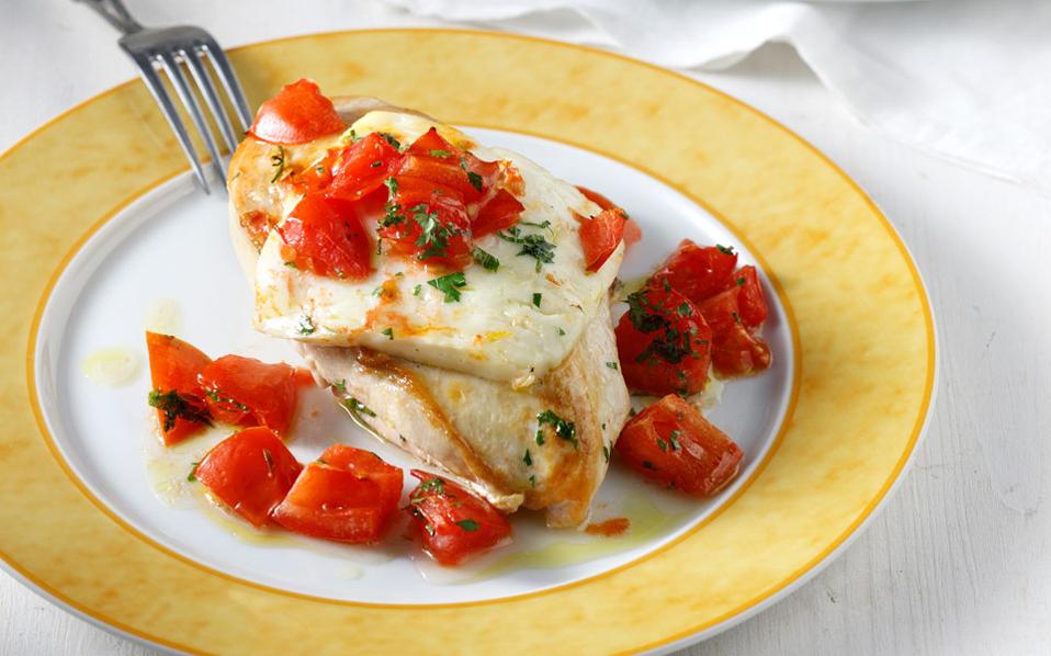 Σε ένα μεγάλο μπολ ανακατεύουμε την ντομάτα, το μαϊντανό, το ελαιόλαδο, αλάτι και πιπέρι. Βάζουμε πάνω σε κάθε φιλέτο γαλοπούλας μία φέτα μαστέλο και από πάνω το μείγμα με την ντομάτα. Ψήνουμε για περίπου 20 - 25 λεπτά ή μέχρι να ψηθεί η γαλοπούλα.