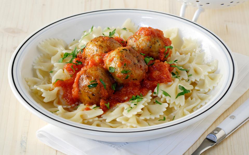 Σάλτσα: Σε μια μεγάλη ρηχή κατσαρόλα σε δυνατή φωτιά ρίχνουμε το σκόρδο μαζί με το ελαιόλαδο και, όταν αρχίσει να βγάζει το άρωμά του σε περίπου 2 λεπτά, ρίχνουμε την ντομάτα και 1 φλιτζάνι νερό. Χαμηλώνουμε τη φωτιά και σιγοβράζουμε για 15 λεπτά. Μετά ρίχνουμε τα κεφτεδάκια και μαγειρεύουμε για 15 λεπτά ακόμα.