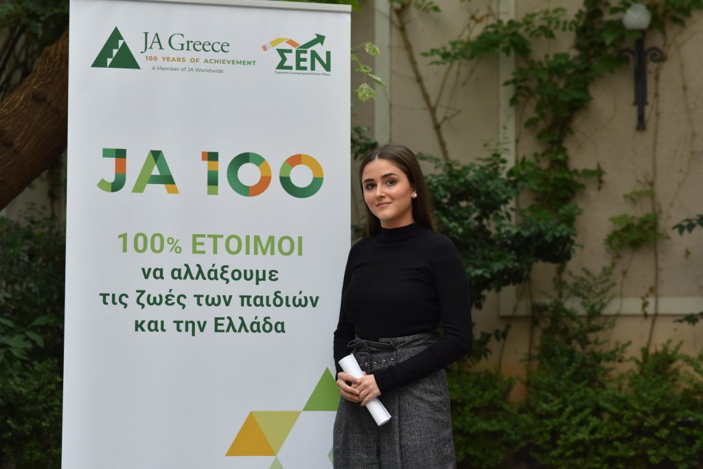 Στην κατάμεστη αίθουσα, στα γραφεία του ΣΕΒ στο Σύνταγμα, ο Πρόεδρος του ΣΕΝ/JA Greece, κ. Μάρκος Βερέμης απένειμε την υποτροφία των 20.000 ευρώ στη Μαρία Κοκάλα από το χωριό Σφενδάμη της Πιερίας.