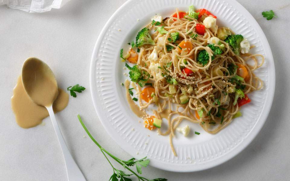 Σκορπίζουμε το σουσάμι και μοιράζουμε στα πιάτα. Αν θέλουμε, βάζουμε 1 κουταλιά ταχίνι σε κάθε πιάτο και σερβίρουμε.