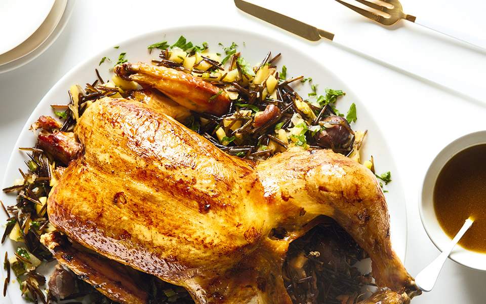 Το άγριο ρύζι δίνει μια γήινη νότα στην ιδιαίτερη γέμιση του κόκορα.