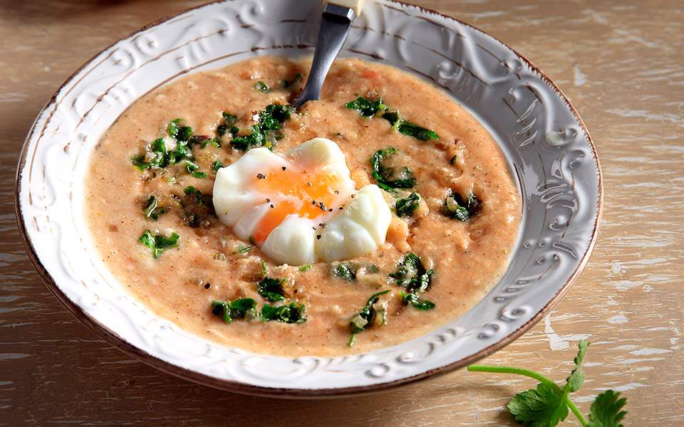 Σούπα με τραχανά, καυκαλήθρες και αυγό ποσέ