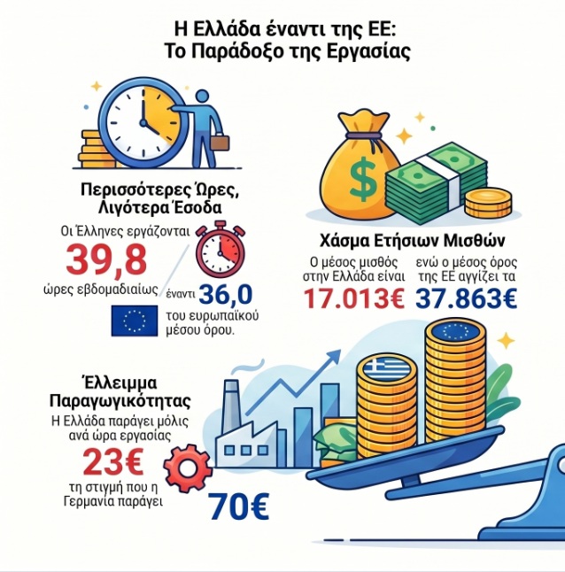 Συνοπτικά, η Ελλάδα χαρακτηρίζεται από έναν συνδυασμό υψηλών ωρών εργασίας, χαμηλών αποδοχών και μειωμένης αγοραστικής δύναμης, με το χάσμα από τον ευρωπαϊκό μέσο όρο να παραμένει μεγάλο παρά τις επιμέρους αυξήσεις.